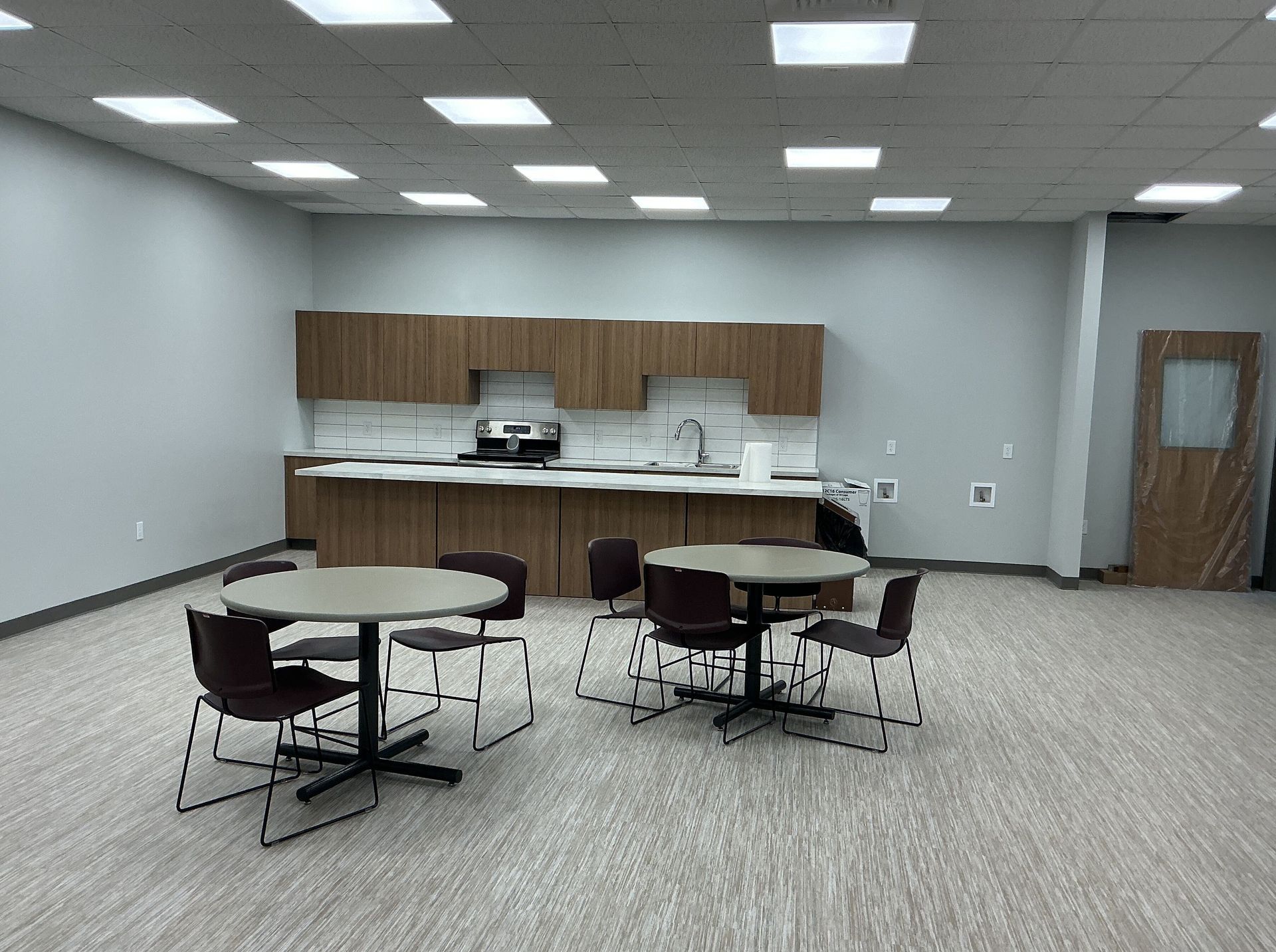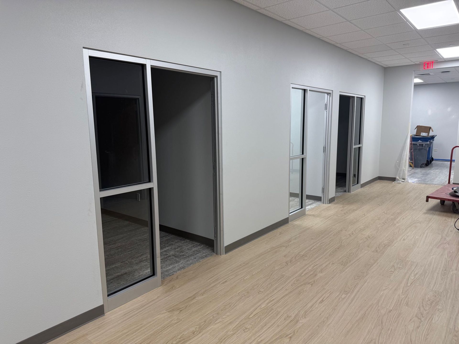 Interior office renovations including office space, breakroom, bathroom, and conference room.